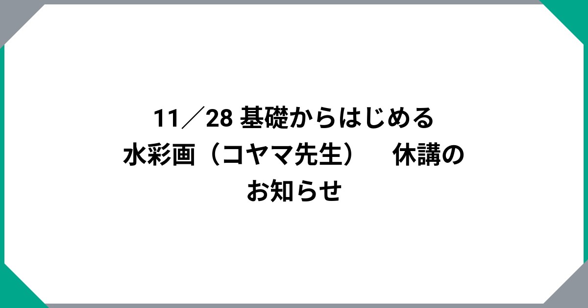 11/28 基礎からはじめる水彩画(コヤマ先生) 休講のお知らせ 11/28の「基礎からはじめる水彩画」講座(コヤマ先生)ですが、講師の体調不良のため、休講となります。 補講は決まり次第ご案内いたします。 ご了承くださいますよう、よろしくお願い申し上げます。 2025年11月28日 INFO 「森吉 健先生のグループ展 Esposzione Tre 展 が開催されます。 2025年11月29日(土)〜12月6日(土) ギャラリーアルトン」 「蔡國華先生が個展を開催します。 12月9日〜16日 クリロンワークショップ画空間」